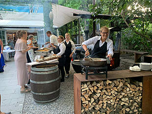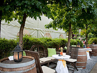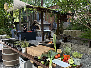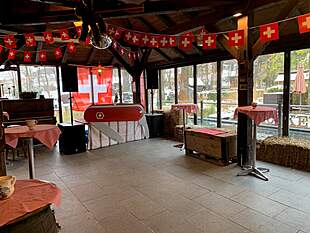 Das vorhandene Aussenmobiliar aus Holz und Stein (ca. 40 Sitzplätze) steht Ihnen zur freien Verfügung. Zusätzliche Möbel oder Infrastruktur können je nach Bedarf individuell dazu gemietet werden.